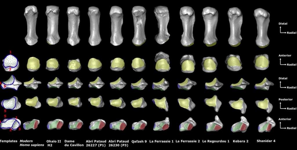 Los autores encontraron covariación en la forma y la orientación relativa de las articulaciones del complejo trapeciometacarpiano que sugieren diferentes movimientos repetitivos del pulgar en los neandertales en comparación con los humanos modernos.