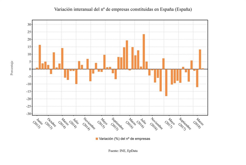 En tasa mensual (mayo sobre abril), la creación de sociedades mercantiles subió un 0,1%, mientras que la disolución de sociedades se incrementó un 2,6%. Ambos datos contrastan con los aumentos mensuales superiores al 12% que registraron en mayo de 2017.