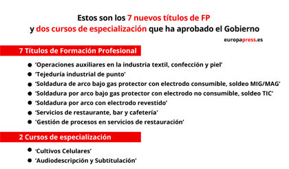 "La actualización de estas cualificaciones, tras la revisión completa del Catálogo Nacional de Cualificaciones Profesionales, permitirá diseñar nuevos títulos de Formación Profesional y certificados de profesionalidad adaptados a las necesidades del sistema productivo", ha explicado el Ministerio este viernes.